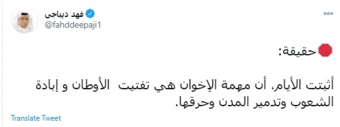 وكتب في تغريدة عبر "تويتر" رصدها "المشهد العربي": "حقيقة: أثبتت الأيام، أن مهمة الإخوان هي تفتيت الأوطان وإبادة الشعوب وتدمير المدن وحرقها".