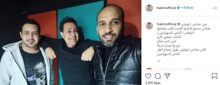 ونشر حكيم صورة من داخل "الاستديو"، عبر حسابه الرسمي بموقع "إنستجرام"، وعلق: "مين صاحي دلوقتي علشان يسمع الأغنية الجديد اللى بنعملها دلوقتي (الناس السهرانين) كلمات شفيق كارم، لحن تامر حجاج، توزيع ميدو مزيكا".