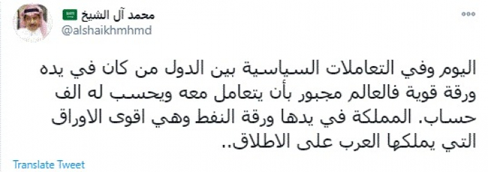 وقال في تغريدة عبر "تويتر" رصدها "المشهد العربي": "اليوم وفي التعاملات السياسية بين الدول من كان في يده ورقة قوية فالعالم مجبور بأن يتعامل معه ويحسب له ألف حساب".