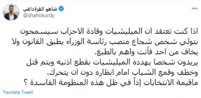 وقال في تغريدة عبر "تويتر" رصدها "المشهد العربي": "إذا كنت تعتقد أن المليشيات وقادة الأحزاب سيسمحون بتولي شخص شجاع منصب رئاسة الوزراء يطبق القانون ولا يخاف من أحد فأنت واهم بالطبع".