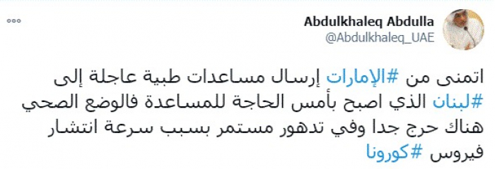 وكتب في تغريدة عبر "تويتر" رصدها "المشهد العربي": "أتمنى من الإمارات إرسال مساعدات طبية عاجلة إلى لبنان الذي اصبح بأمس الحاجة للمساعدة فالوضع الصحي هناك حرج جدا وفي تدهور مستمر بسبب سرعة انتشار فيروس كورونا".