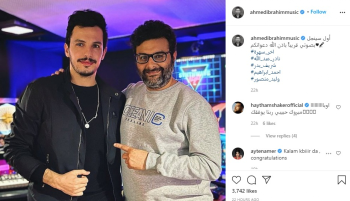 ونشر "إبراهيم"، صورة له رفقة المنتج وليد منصور، وعلّق عليها: "أول سينجل بصوتي قريبًا بإذن الله دعواتكم".