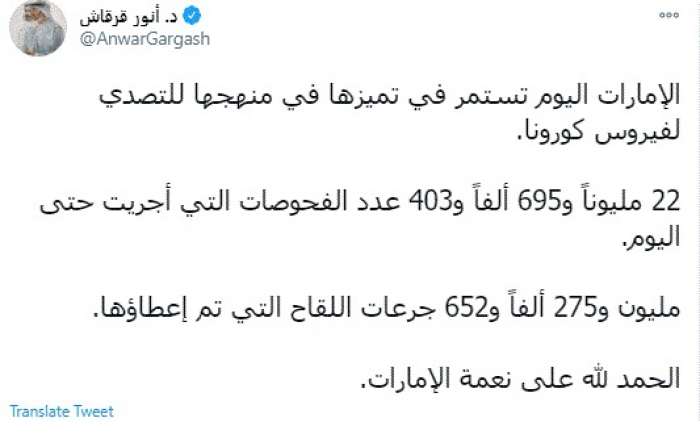 وأضاف: "مليون و275 ألفاً و652 جرعات اللقاح التي تم إعطاؤها. الحمد لله على نعمة الإمارات".