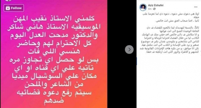 وأعاد "الشافعي"، نشر تحذير "رامي" عبر "فيسبوك"، وعلّق: "أولا- هي دعوى مش دعوة، دعوة دي لما تعزمنا على حفلة.. ثانيا- إحنا صحاب الحق مش أنت خالص.. ثالثاً- بالنسبة لتهديدك لينا باللجوء للقضاء فدي الحاجة الوحيدة الصح اللي أنت قولتها وأنا مكنش في بالي خالص أخد حقي منك في اتهامك الكاذب ليّا من خلال القضاء".