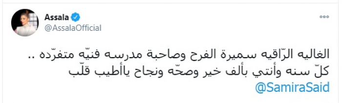 وكتبت أصالة تغريدة، عبر حسابها الرسمي بموقع تويتر: "الغالية الرّاقية سميرة الفرح وصاحبة مدرسة فنية متفرّدة، كلّ سنة وأنتي بألف خير وصحّة ونجاح يا أطيب قلّب سميرة سعيد".