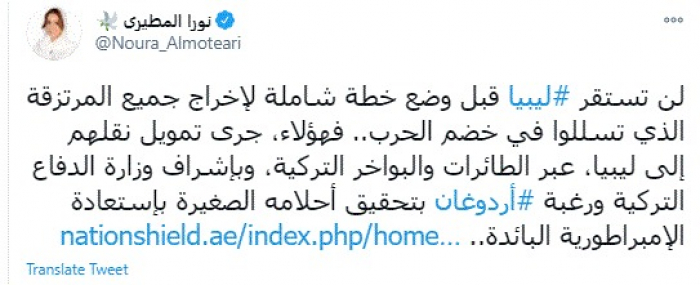 دعت الكاتبة والباحثة نورا المطيري، اليوم، لوضع خطة شاملة لإخراج المرتزقة في ليبيا، مؤكدةً أن الرئيس التركي رجب طيب أردوغان استخدمهم كورقة لتحقيق أحلامه واستعادة إمبراطوريته البائدة.