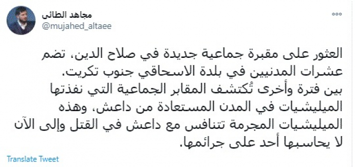 وكتب في تغريدة عبر "تويتر" رصدها "المشهد العربي": "العثور على مقبرة جماعية جديدة في صلاح الدين، تضم عشرات المدنيين في بلدة الاسحاقي جنوب تكريت".