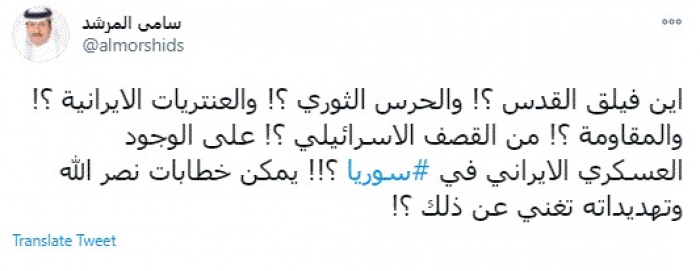 وقال في تغريدة عبر "تويتر" رصدها "المشهد العربي": "أين فيلق القدس؟ والحرس الثوري؟ والعنتريات الإيرانية؟ والمقاومة؟ من القصف الإسرائيلي؟ على الوجود العسكري الإيراني في سوريا؟ يمكن خطابات نصر الله وتهديداته تغني عن ذلك؟".
