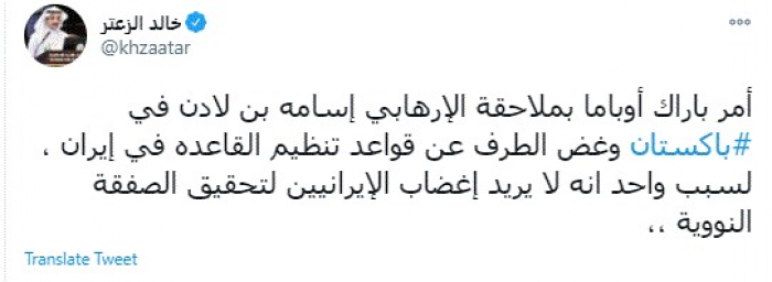 وقال في تغريدة عبر "تويتر" رصدها "المشهد العربي": "أمر باراك أوباما بملاحقة الإرهابي أسامه بن لادن في باكستان وغض الطرف عن قواعد تنظيم القاعدة في إيران، لسبب واحد إنه لا يريد إغضاب الإيرانيين لتحقيق الصفقة النووية".