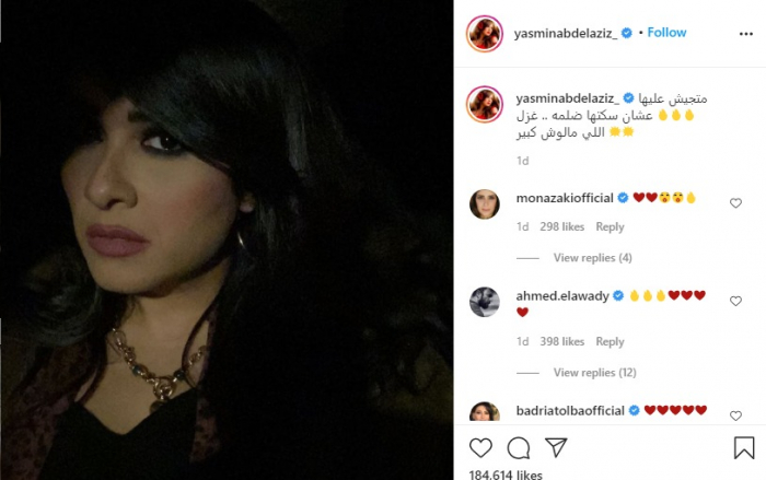 ونشرت ياسمين صورة لها عبر حسابها بموقع "إنستجرام"، وعلّقت عليها: "متجيش عليها عشان سكتها ضلمة.. غزل.. اللي مالوش كبير".