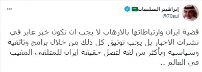 السليمان ينتقد تجاهل الإعلام العربي لارتباط إيران بالإرهاب