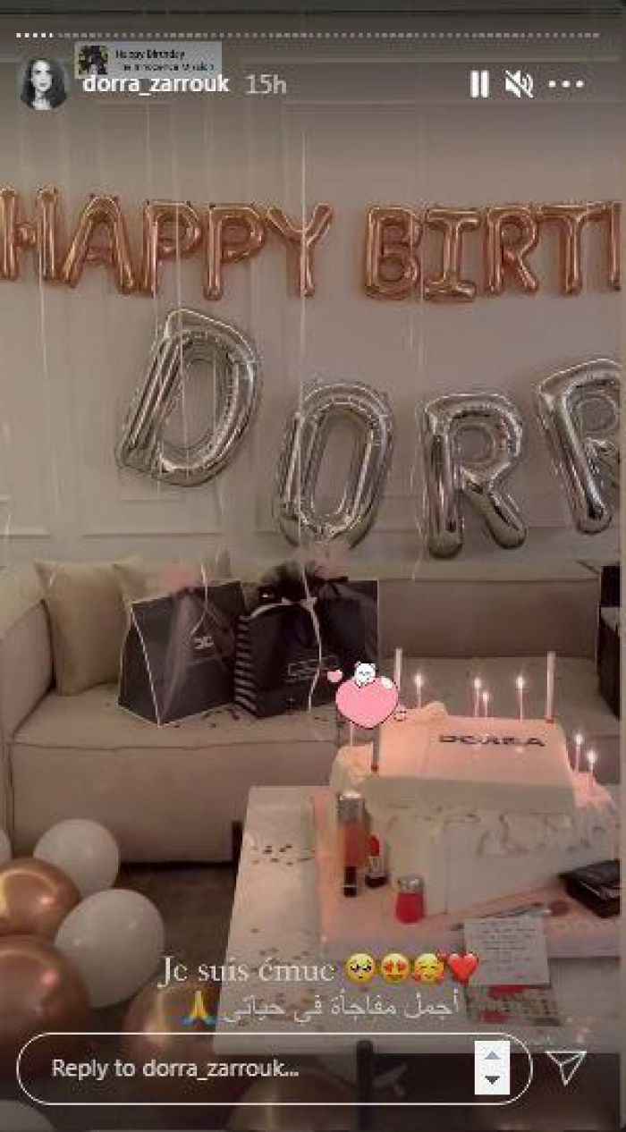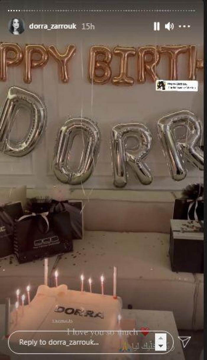 ونشرت دُرة عبر خاصية القصص القصيرة بحسابها على "إنستجرام"، عدد من الفيديوهات التي كشفت عن هدايا زوجها لها، ومن بينها مكياج وتورتة تحمل اسمها، وعلّقت: "أجمل مفاجأة في حياتي، ربنا يخليك ليّا".