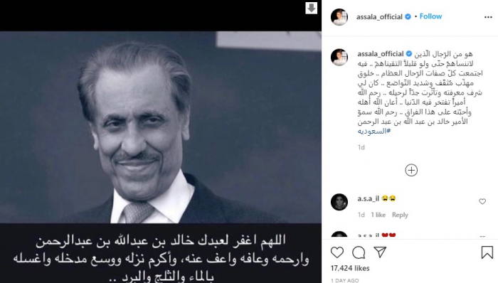 ونشرت أصالة صورة للأمير الراحل، عبر حسابها الرسمي بموقع "إنستجرام"، وعلّقت: "هو من الرجال الذين لا ننساهم حتى ولو قليلا التقيناهم.. فيه اجتمعت كل صفات الرجال العظام.. خلوق مهذب مثقف وشديد التواضع.. كان لي شرف معرفته وتأثرت جداً لرحيله.. رحم الله أميراً تفتخر فيه الدنيا.. أعان الله أهله وأحبته على هذا الفراق.. رحم الله سمو الأمير خالد بن عبد الله بن عبد الرحمن".