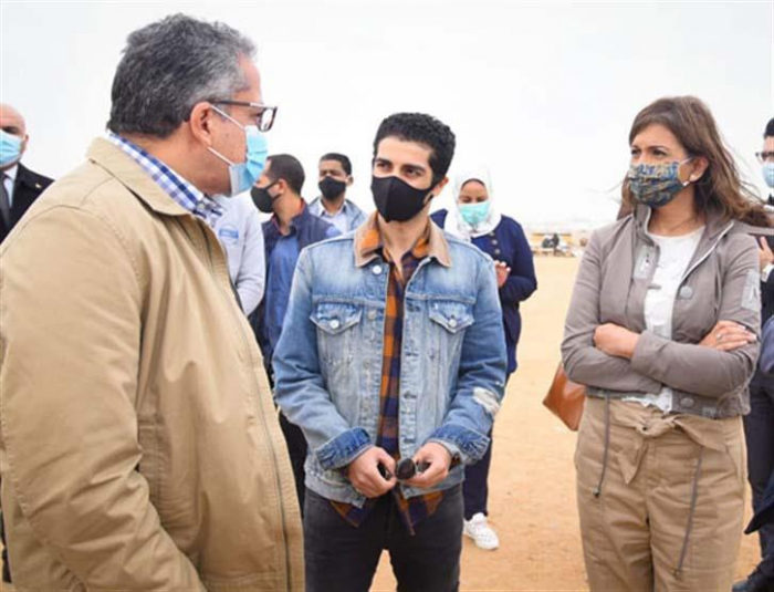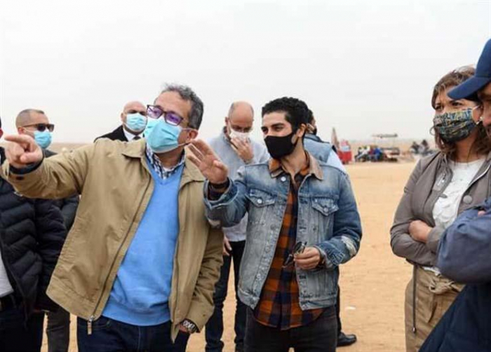 وصاحب مينا مسعود، خلال الجولة السياحية كل من الدكتور خالد العناني وزير السياحة والآثار المصري، والسفيرة نبيلة مكرم عبدالشهيد وزيرة الدولة للهجرة وشؤون المصريين بالخارج.