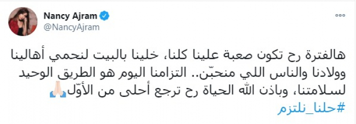 وكتبت "نانسي" عبر حسابها الرسمي بموقع تويتر: "هالفترة رح تكون صعبة علينا كلنا، خلينا بالبيت لنحمي أهالينا وأولادنا والناس اللي منحبّن، التزامنا اليوم هو الطريق الوحيد لسلامتنا، وبإذن الله الحياة رح ترجع أحلى من الأوّل".