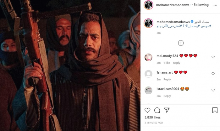 نشر محمد رمضان، صورة جديدة من كواليس تصوير مسلسله الجديد "موسى"، المقرر عرضه خلال موسم دراما رمضان 2021، حيث ظهر فى الصورة وهو يحمل سلاحه خلال أحد المشاهد، ونشر الصورة عبر حسابه بموقع "انستجرام"، مصحوبة بتعليق، "موسى رمضان 2021 ثقة فى الله نجاح"، والمسلسل إنتاج شركة سينرچى، تأليف ناصر عبد الرحمن، إخراج محمد سلامة.
