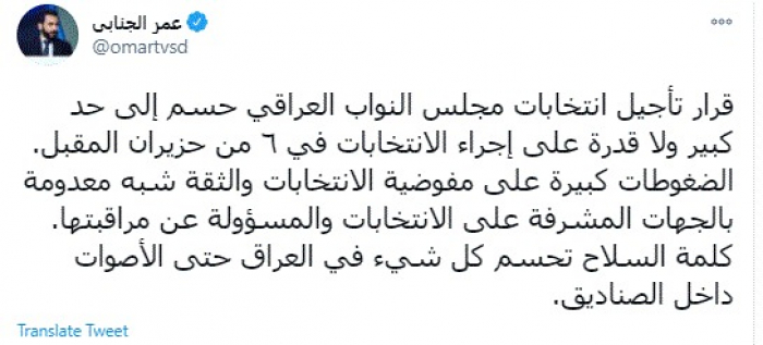 وقال في تغريدة عبر "تويتر" رصدها "المشهد العربي": "قرار تأجيل انتخابات مجلس النواب العراقي حسم إلى حد كبير ولا قدرة على إجراء الانتخابات في ٦ من حزيران المقبل".