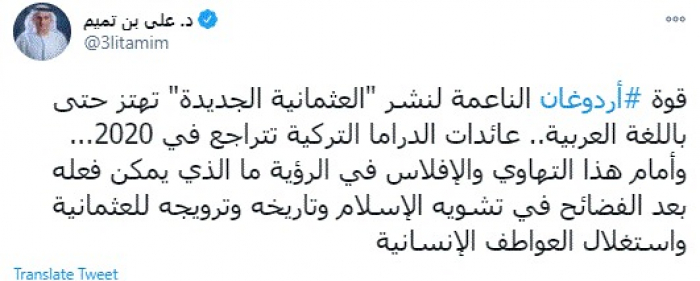 وقال في تغريدة عبر "تويتر" رصدها "المشهد العربي": "قوة أردوغان الناعمة لنشر "العثمانية الجديدة" تهتز حتى باللغة العربية.. عائدات الدراما التركية تتراجع في 2020... وأمام هذا التهاوي والإفلاس في الرؤية ما الذي يمكن فعله بعد الفضائح في تشويه الإسلام وتاريخه وترويجه للعثمانية واستغلال العواطف الإنسانية".