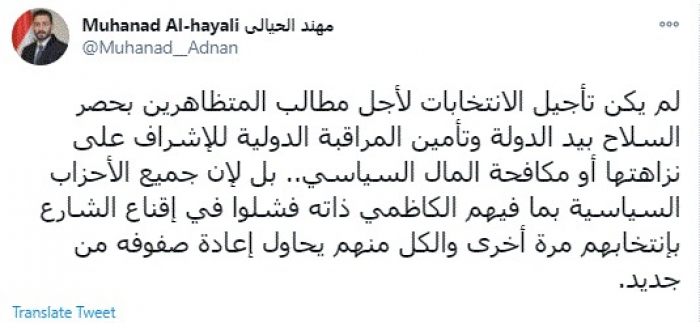 وقال في تغريدة عبر "تويتر" رصدها "المشهد العربي": "لم يكن تأجيل الانتخابات لأجل مطالب المتظاهرين بحصر السلاح بيد الدولة وتأمين المراقبة الدولية للإشراف على نزاهتها أو مكافحة المال السياسي".