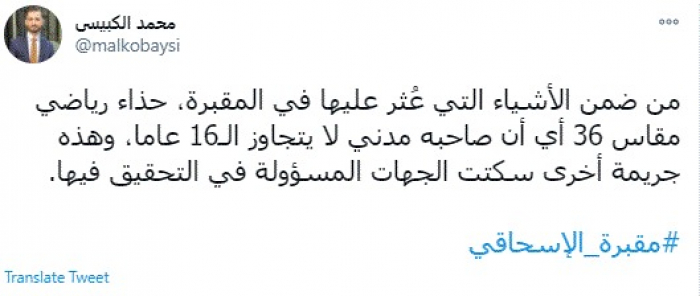 وقال في تغريدة عبر "تويتر" رصدها "المشهد العربي": "من ضمن الأشياء التي عُثر عليها في المقبرة، حذاء رياضي مقاس 36 أي أن صاحبه مدني لا يتجاوز الـ16 عاما، وهذه جريمة أخرى سكتت الجهات المسؤولة في التحقيق فيها. مقبرة الإسحاقي".