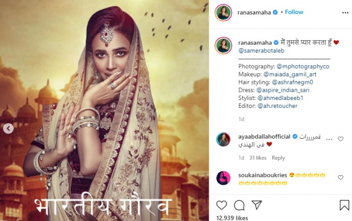 وظهرت رنا وزوجها الملحن سامر أبو طالب في الصور وهما يرتديان الزي الهندي، وعلقت "رنا"، على الصور باللغة الهندية قائلة: "الرومانسية الهندية".