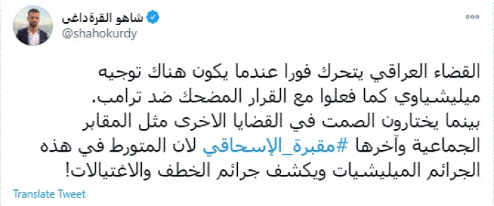 استنكر الكاتب الصحفي العراقي شاهو القرةداغي، اليوم، تحكم المليشيات الموالية لإيران في القضاء العراقي.