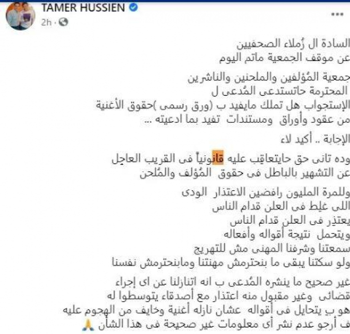 وكتب حسين، عبر حسابه بـ"فيسبوك": "جمعية المُؤلفين والملحنين والناشرين المحترمة حاتستدعى المُدعي للاستجواب"، مضيفًا: "هل تملك ما يفيد بورق رسمى حقوق الأغنية من عقود وأوراق ومستندات تفيد بما ادعيته؟.. الإجابة أكيد لا".