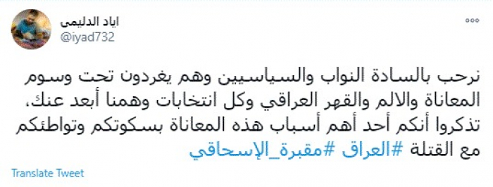 وقال في تغريدة عبر "تويتر" رصدها "المشهد العربي": "نرحب بالسادة النواب والسياسيين وهم يغردون تحت وسوم المعاناة والالم والقهر العراقي وكل انتخابات وهمنا أبعد عنك، تذكروا أنكم أحد أهم أسباب هذه المعاناة بسكوتكم وتواطئكم مع القتلة".