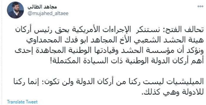 وقال في تغريدة عبر "تويتر" رصدها "المشهد العربي": "تحالف الفتح: نستنكر الإجراءات الأمريكية بحق رئيس أركان هيئة الحشد الشعبي الأخ المجاهد ابو فدك المحمداوي ونؤكد أن مؤسسة الحشد وقيادتها الوطنية المجاهدة إحدى أهم أركان الدولة الوطنية ذات السيادة المكتملة.. المليشيات ليست ركنا من أركان الدولة ولن تكون؛ إنما ركنا للادولة وهي كذلك".