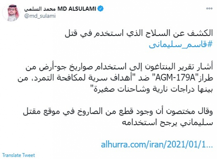وقال في تغريدة عبر "تويتر" رصدها "المشهد العربي": "الكشف عن السلاح الذي استخدم في قتل قاسم سليمانی أشار تقرير البنتاغون إلى استخدام صواريخ جو-أرض من طراز AGM-179A ضد أهداف سرية لمكافحة التمرد، من بينها دراجات نارية وشاحنات صغيرة وقال مختصون أن وجود قطع من الصاروخ في موقع مقتل سليماني يرجح استخدامه".