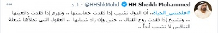 وقال في تغريدة على حسابه بموقع التدوين المصغر تويتر، اليوم إني: "علمتني الحياة.. أن الدول تشيب إذا فقدت حماستها.. وتهرم إذا فقدت دافعيتها... وتشيخ إذا فقدت روح القتال.. حتى وإن زاد شبابها.. العقول التي تملأها شعلة التنافس لا تشيب أبدًا".