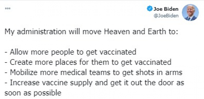 وقال في تغريدة على حسابه بموقع التدوين المصغر تويتر، اليوم إن: "إدارتي ستحرك السماء والأرض للسماح بتلقيح المزيد من الناس وخلق المزيد من الأماكن لتلقيحهم وحشد المزيد من الفرق الطبية لتحصين المواطنين، وزيادة إمدادات اللقاح في المناطق المفتوحة".