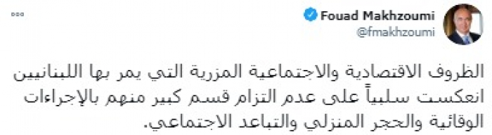 وأكد في تغريدة على حسابه بموقع التدوين المصغر تويتر، اليوم أن: "الظروف الاقتصادية والاجتماعية المزرية التي يمر بها اللبنانيين انعكست سلبيًا على عدم التزام قسم كبير منهم بالإجراءات الوقائية والحجر المنزلي والتباعد الاجتماعي".