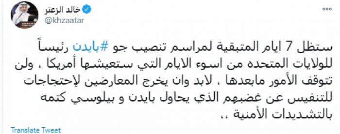 توقع المحلل السياسي السعودي خالد الزعتر، اليوم، استمرار الاحتجاجات في الولايات المتحدة الأمريكية، رغم اقتراب لحظة مراسم تنصيب الرئيس المنتخب جو بايدن.