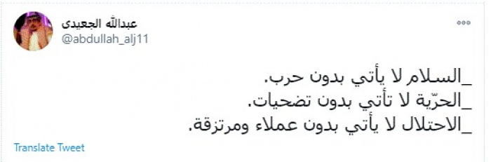 قال الشاعر عبدالله الجعيدي، اليوم، إن السلام لا يأتي بدون حرب، مؤكدًا في الوقت ذاته أن الحرّية لا تأتي بدون تضحيات.
