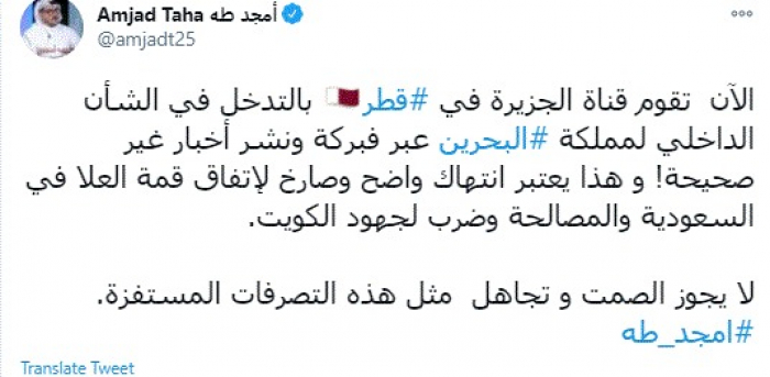 وقال في تغريدة عبر "تويتر" رصدها "المشهد العربي": "الآن تقوم قناة الجزيرة في قطر بالتدخل في الشأن الداخلي لمملكة البحرين عبر فبركة ونشر أخبار غير صحيحة! وهذا يعتبر انتهاك واضح وصارخ لإتفاق قمة العلا في السعودية والمصالحة وضرب لجهود الكويت".
