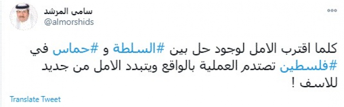 وقال في تغريدة عبر "تويتر" رصدها "المشهد العربي": "كلما اقترب الأمل لوجود حل بين السلطة وحماس في فلسطين تصتدم العملية بالواقع ويتبدد الآمل من جديد للأسف".