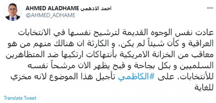 وقال في تغريدة عبر "تويتر" رصدها "المشهد العربي": "عادت نفس الوجوه القديمة لترشيح نفسها في الانتخابات العراقية وكأن شيئاً لم يكن، والكارثة ان هنالك منهم من هو معاقب من الخزانة الأمريكية بانتهاكات ارتكبها ضد المتظاهرين السلميين وبكل بجاحة ويظهر الآن مرشحاً نفسه للانتخابات، على الكاظمي تأجيل هذا الموضوع لأنه مخزي للغاية".