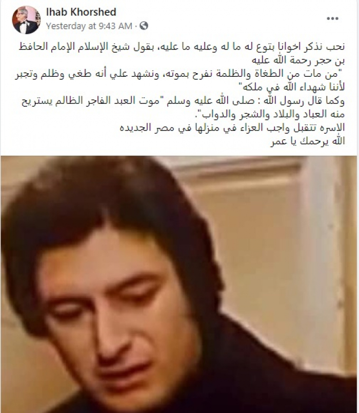 وكتب إيهاب خورشيد، عبر حسابه على "فيسبوك"، قائلا "نحب نذكر إخوانا بتوع له ما له، وعليه ما عليه، بقول شيخ الإسلام الإمام الحافظ بن حجر رحمة الله عليه (من مات من الطغاة والظلمة نفرح بموته، ونشهد على أنه طغى وظلم وتجبر لأننا شهداء الله في ملكه)".