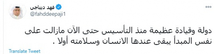 وقال في تغريدة عبر "تويتر" رصدها "المشهد العربي": "دولة وقيادة عظيمة منذ التأسيس حتى الآن مازالت على نفس المبدأ يبقى عندها الانسان وسلامته أولاً".