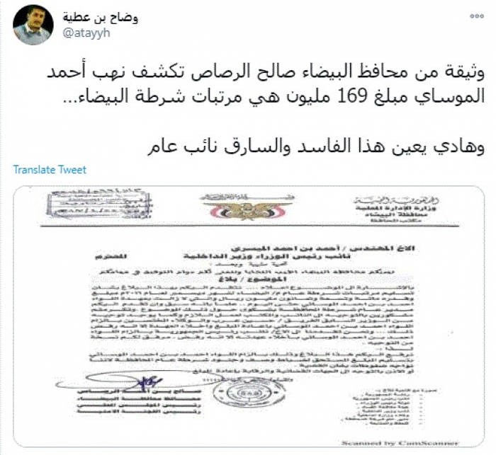 وقال في تغريدة عبر "تويتر" رصدها "المشهد العربي": "وثيقة من محافظ البيضاء صالح الرصاص تكشف نهب أحمد الموساي مبلغ 169 مليون هي مرتبات شرطة البيضاء".