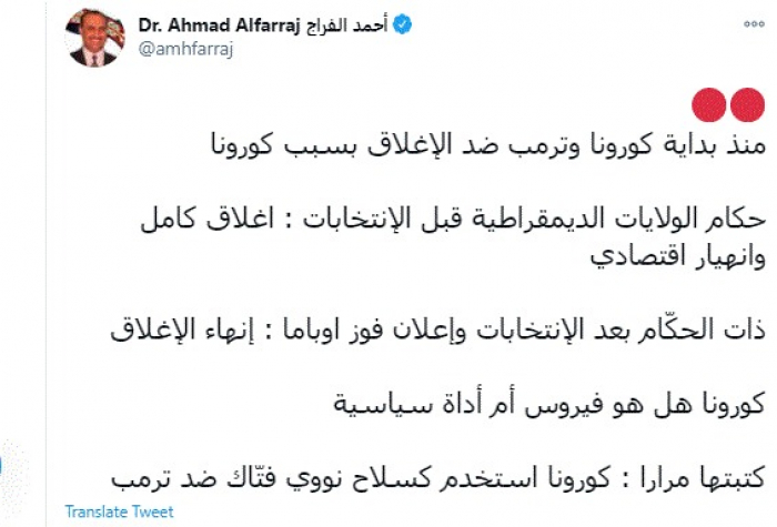 وقال في تغريدة عبر "تويتر" رصدها "المشهد العربي": "منذ بداية كورونا وترمب ضد الإغلاق بسبب كورونا حكام الولايات الديمقراطية قبل الإنتخابات: إغلاق كامل وانهيار اقتصادي ذات الحكّام بعد الإنتخابات وإعلان فوز بايدن: إنهاء الإغلاق كورونا هل هو فيروس أم أداة سياسية كتبتها مرارا : كورونا استخدم كسلاح نووي فتّاك ضد ترمب".