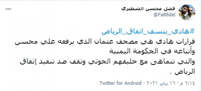 وكتب "الشطيري" تغريدة عبر حسابه بتويتر، رصدها "المشهد العربي" قال فيها: "قرارات هادي هي مصحف عثمان الذي يرفعه علي محسن وأتباعه في الحكومة اليمنية".