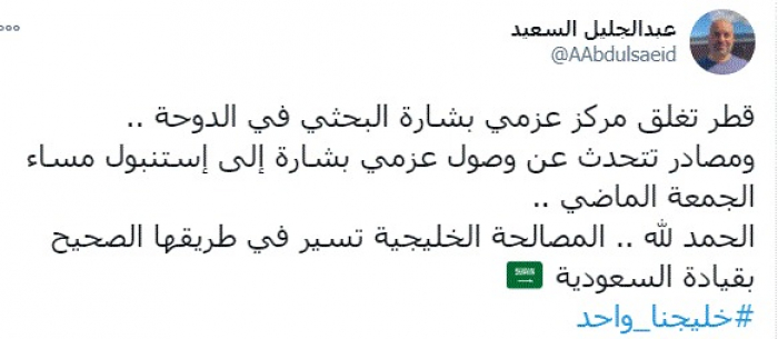 وقال في تغريدة عبر "تويتر" رصدها "المشهد العربي": "قطر تغلق مركز عزمي بشارة البحثي في الدوحة.. ومصادر تتحدث عن وصول عزمي بشارة إلى إسطنبول مساء الجمعة الماضي.. الحمد لله.. المصالحة الخليجية تسير في طريقها الصحيح بقيادة السعودية".