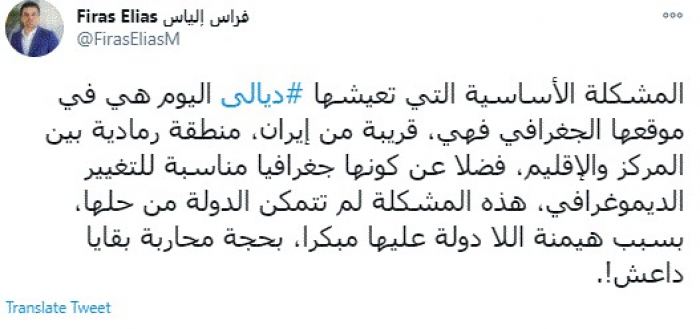 وقال في تغريدة عبر "تويتر" رصدها "المشهد العربي": "المشكلة الأساسية التي تعيشها ديالى اليوم هي في موقعها الجغرافي فهي، قريبة من إيران، منطقة رمادية بين المركز والإقليم، فضلا عن كونها جغرافيا مناسبة للتغيير الديموغرافي، هذه المشكلة لم تتمكن الدولة من حلها، بسبب هيمنة اللا دولة عليها مبكرا، بحجة محاربة بقايا داعش".