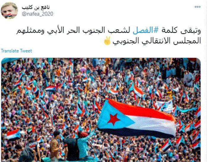 وقال في تغريدة عبر "تويتر" رصدها "المشهد العربي": "وتبقى كلمة الفصل لشعب الجنوب الحر الأبي وممثلهم المجلس الانتقالي الجنوبي".