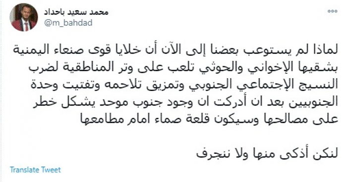 كشف الناشط السياسي محمد سعيد باحداد، اليوم، مُخطط قوى صنعاء بشقيها الإخواني والحوثي للعب على وتر المناطقية لضرب النسيج الاجتماعي الجنوبي.