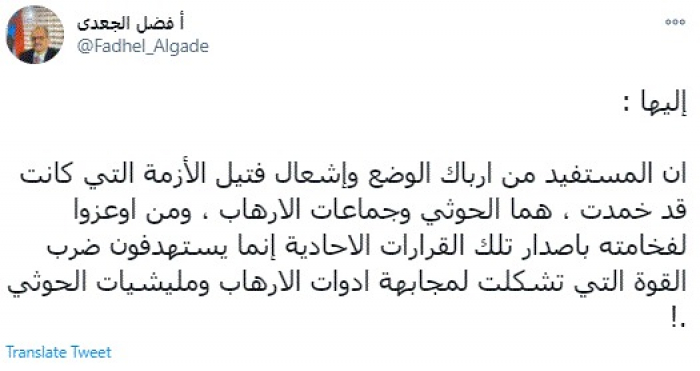 وكتب في تغريدة عبر "تويتر" رصدها "المشهد العربي": "إن المستفيد من إرباك الوضع وإشعال فتيل الأزمة التي كانت قد خمدت، هما الحوثي وجماعات الإرهاب".