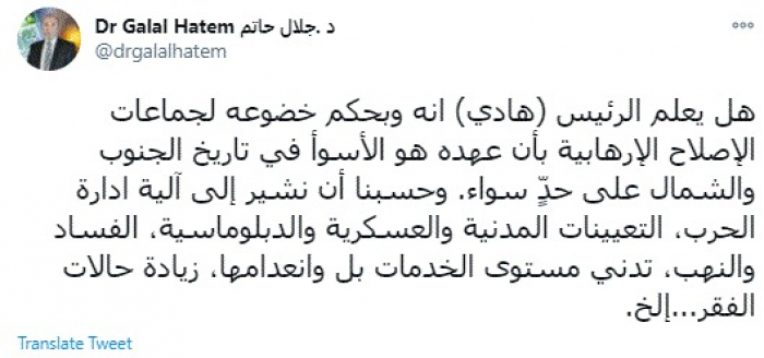 وقال في تغريدة عبر "تويتر" رصدها "المشهد العربي": "هل يعلم الرئيس (هادي) أنه وبحكم خضوعه لجماعات الإصلاح الإرهابية بأن عهده هو الأسوأ في تاريخ الجنوب والشمال على حدٍّ سواء".