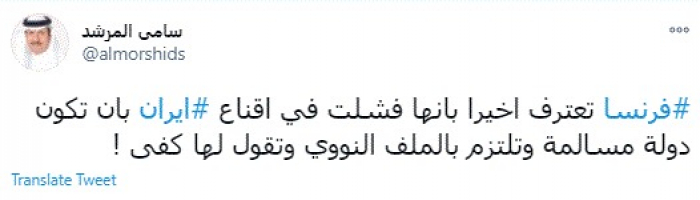 وقال في تغريدة عبر "تويتر" رصدها "المشهد العربي": "فرنسا تعترف أخيرا بانها فشلت في إقناع إيران بان تكون دولة مسالمة وتلتزم بالملف النووي وتقول لها كفى".